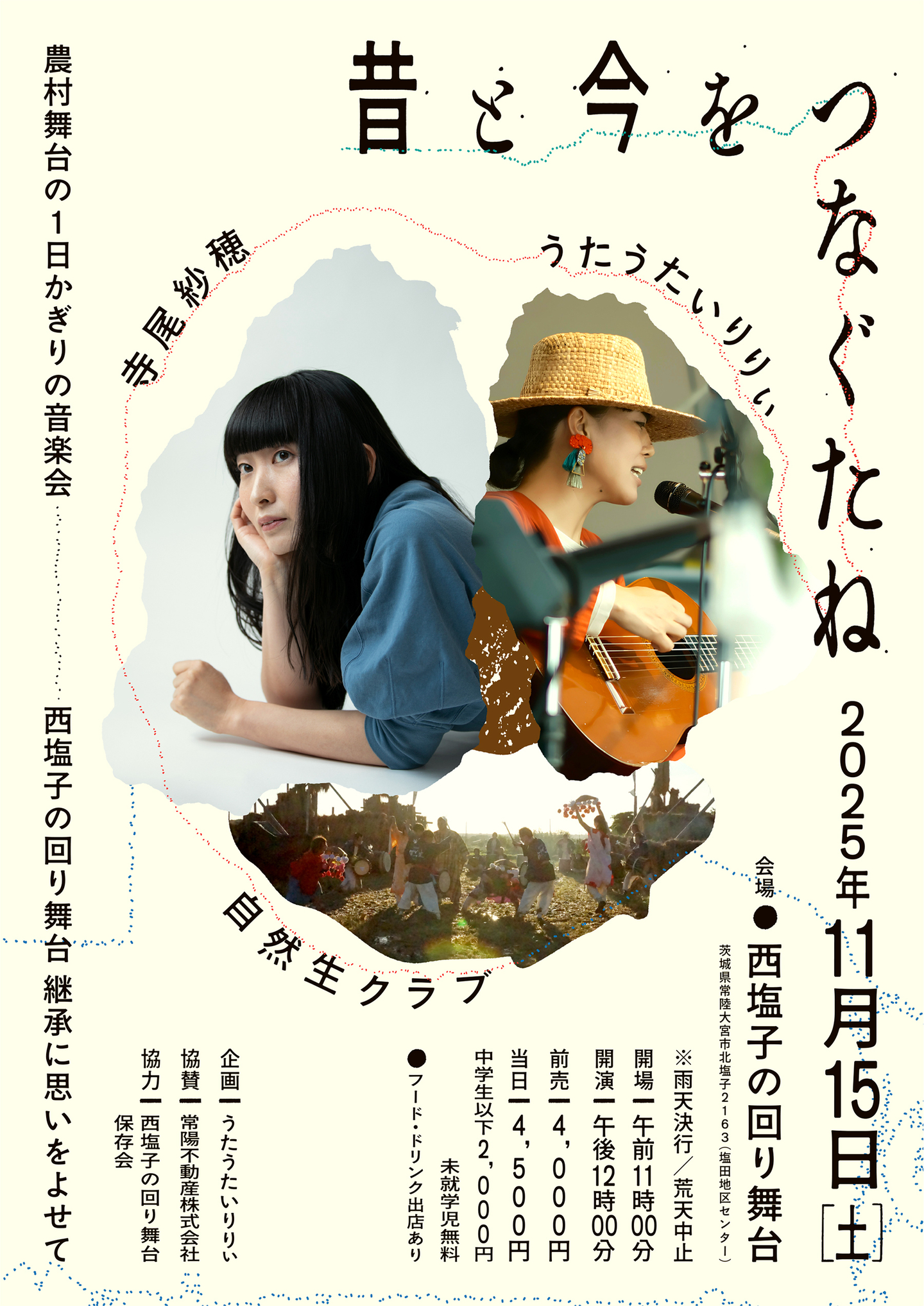 本企画「昔と今をつなぐたね」は、「西塩子の回り舞台」の継承活動に共鳴し、うたうたいりりぃ個人で主催・企画を行います。そのため、イベント趣旨に共感いただいた皆様から、協賛という形でご支援を募集しております。