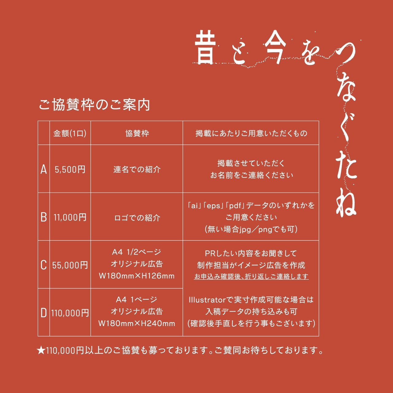 ご協賛いただいた皆様は、本企画終了後に作成する「昔と今をつなぐたね-記録冊子」と「記録映像」に、お名前やロゴを掲載させていただきます。何卒ご協力いただけますと幸いです。